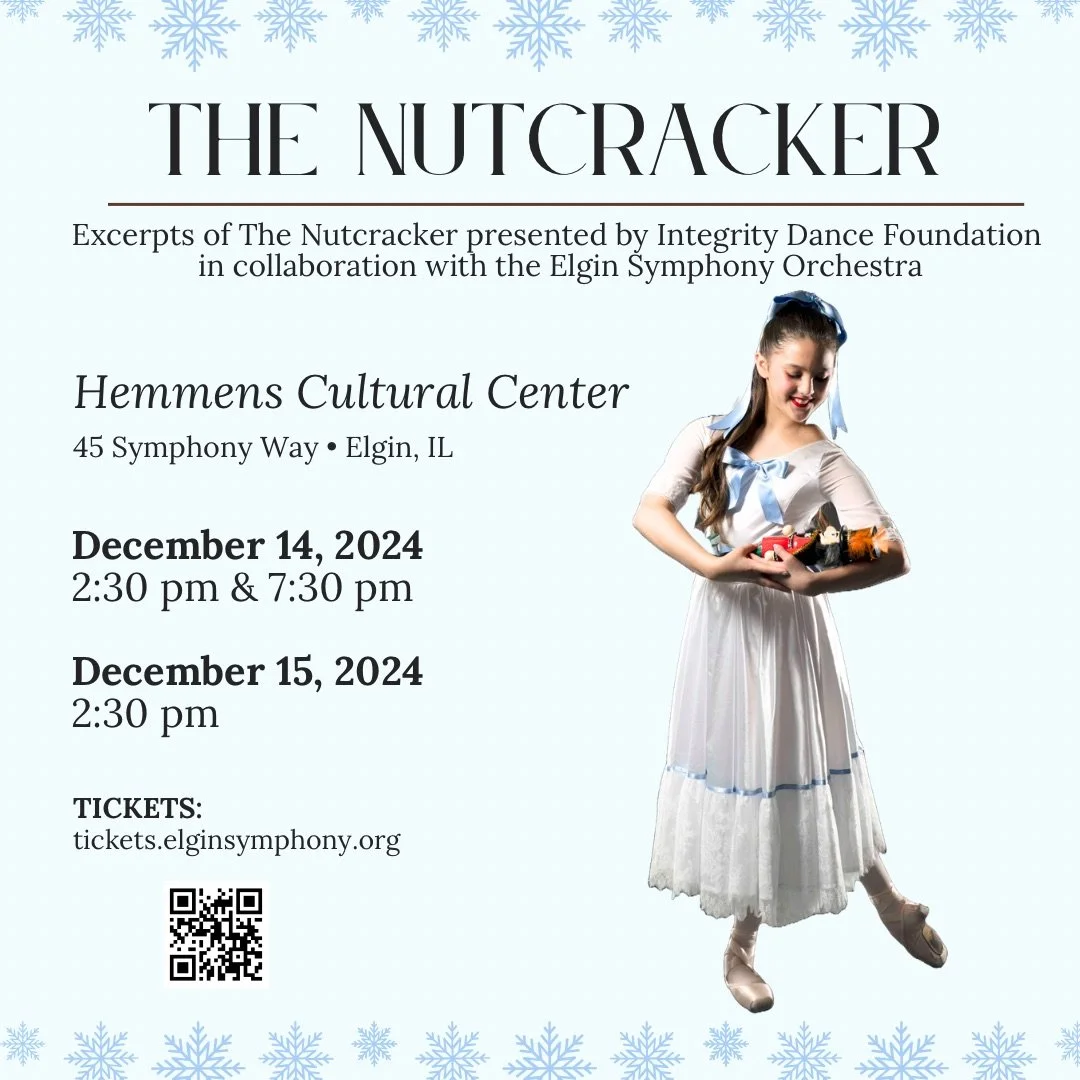 In an effort to recognize and celebrate our ballet dancers, Integrity presents excerpts from the Nutcracker. It is through performances such as this where we hope to inspire young dancers to pursue the beautiful art of ballet and pointe and share this appreciation with our community. Please see below for information on this year’s Nutcracker performances with the Elgin Symphony Orchestra, a unique Nutcracker Experience event for ages 4-9, and a video of Integrity dancers performing Nutcracker excerpts in 2021!